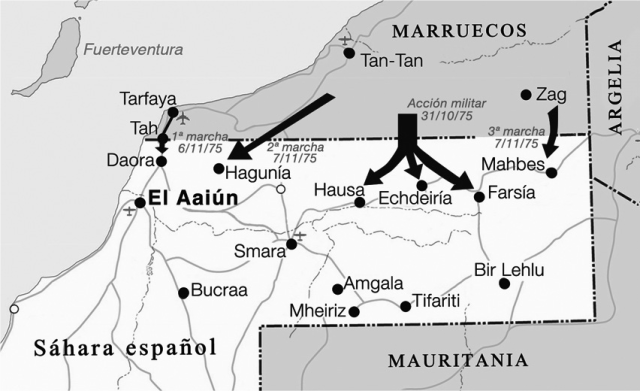 La Marcha Verde entró en el Sáhara Occidental el 6 de noviembre de 1975. Vendieron aquella invasión como una marcha pacífica de 350.000 civiles que cruzaron aquel día el paso fronterizo del Tah, abandonado ya por los españoles. Pero la verdad es que, con un siroco infernal, las Fuerzas Armadas Reales marroquíes (FAR) y las milicias del Frente de Liberación y Unidad (FLU) avanzaron en la vanguardia de aquella marcha camufladas entre grupos de campesinos que portaban banderas marroquíes y ejemplares del Corán. Entre las enseñas, también se podían ver algunas banderas estadounidenses, fiel reflejo de la intromisión de los Estados Unidos en todo aquello.