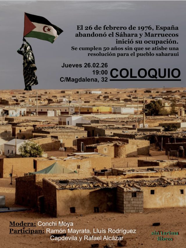 A los 50 años del abandono del Sáhara Occidental por parte de España y en conmemoración, el próximo 27 de febrero, del 50 aniversario de la proclamación de la República Árabe Saharaui Democrática (RASD), se ha organizado un coloquio en Madrid para repasar la situación actual del conflicto del Sáhara y del pueblo saharaui en el presente contexto internacional. El acto tendrá lugar el próximo jueves 26 de febrero, a las 19h, en la librería Sin Tarima Libros de la calle Magdalena 32.